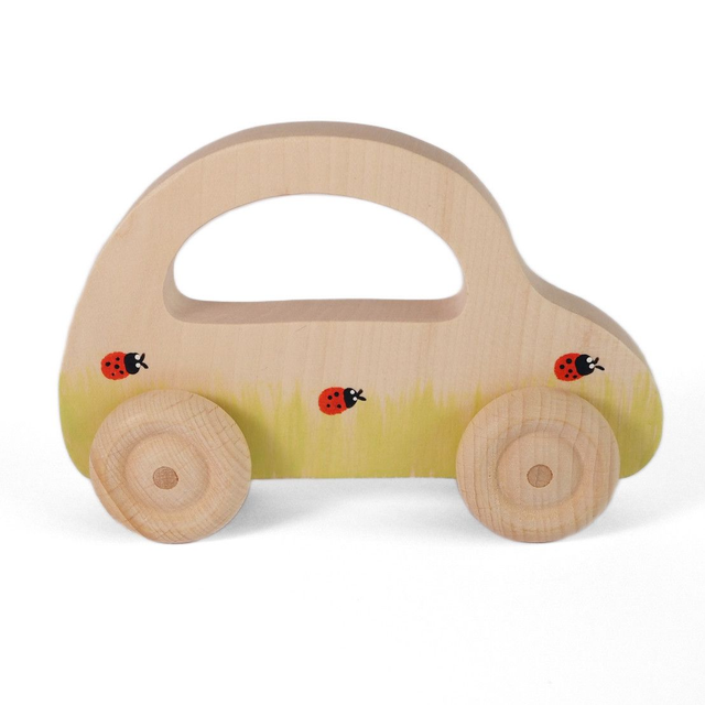 Cette voiture conserve une grande partie de la couleur naturelle du bois, mettant en valeur la beauté du matériau. Sur le bas de la voiture, une peinture originale et toujours différente peinte à la main représente un champ d'herbe où se promènent des coccinelles, ajoutant une touche de poésie. Peinte et vernie avec des produits écologiques, elle allie sécurité et respect de l’environnement.